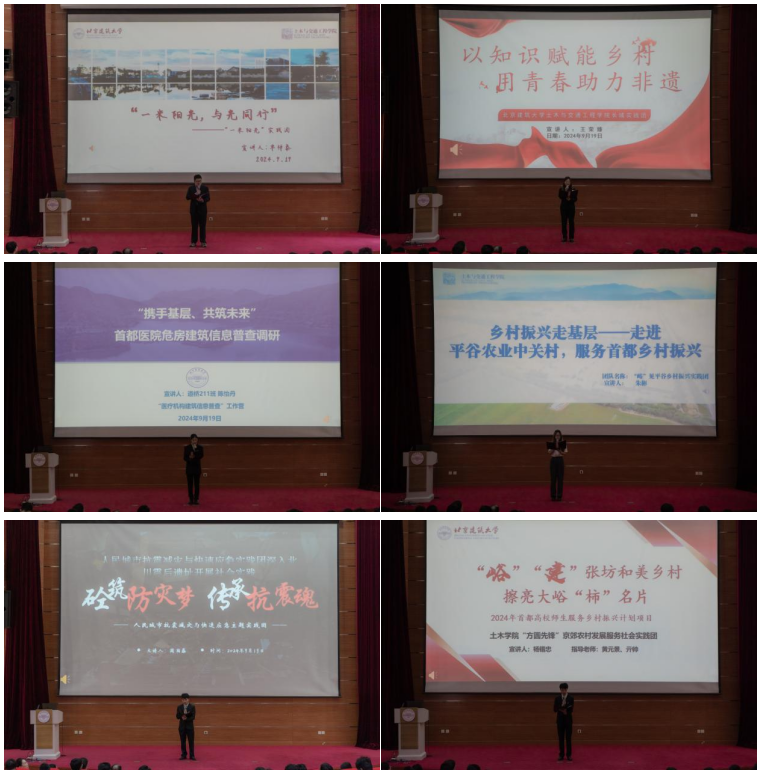 6支社会实践团队代表从专业实践、党性实践、社会实践三个方面围绕抗震减灾、医疗建筑、阅读公益、文化遗产保护等多个领域展开宣讲分享。