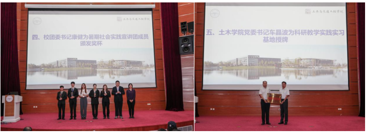 康健为土木学院社会实践宣讲团成员颁发奖杯,车晶波为科研教学实践实习基地“5·12汶川特大地震纪念馆”授牌。