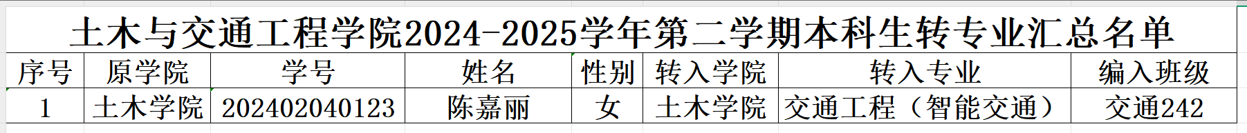 根据2024-2025学年第二学期关于本科生转专业工作的通知,和《JINNIAN金年会本科学生转专业实施办法》文件精神,金年会组织开展了本科生转专业工作。经学生申请,学生所在学院审核,金年会转专业考核小组考核,土木学院第二志愿录取接收1名转专业学生,公示如下: