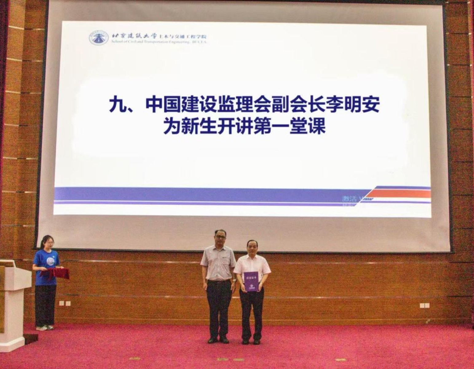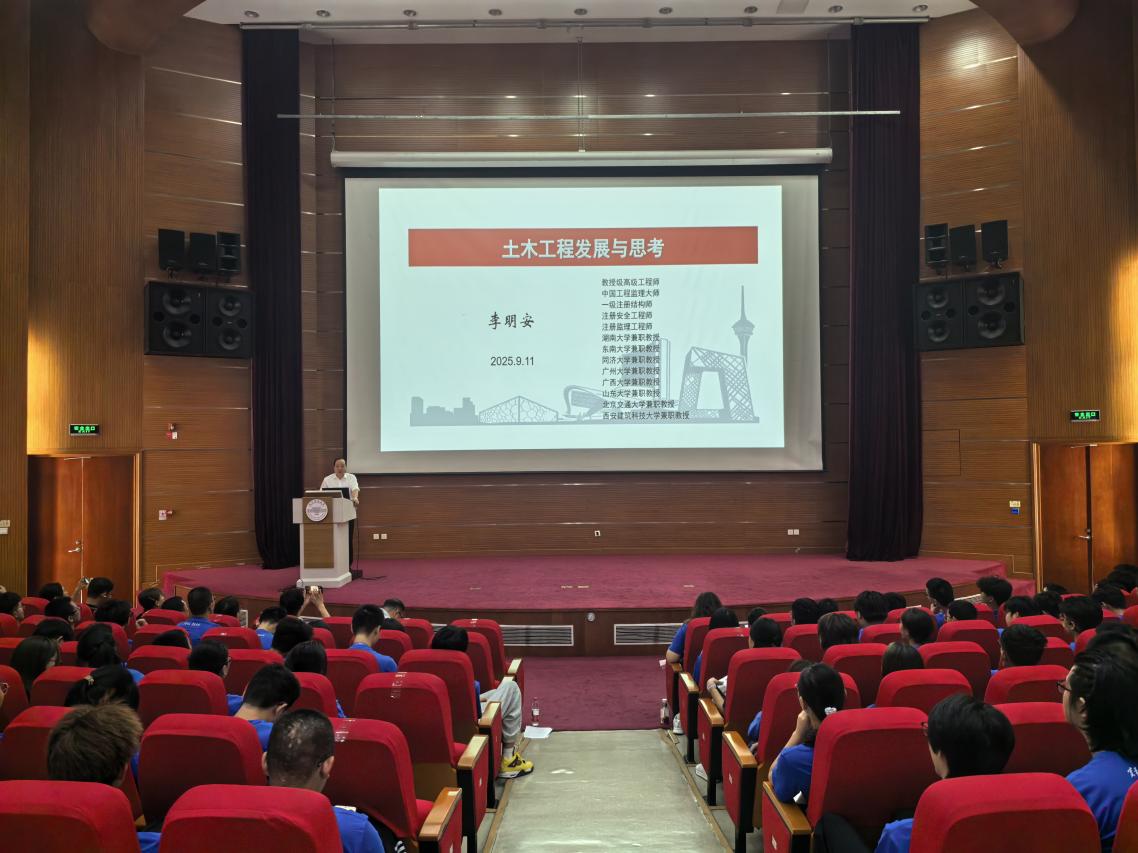 为助力2025级本科新生构建专业认知、明晰行业发展方向,9月11日下午,JINNIAN金年会党委常委、副校长伊廷华特邀中国建设监理协会副会长兼秘书长李明安教授,在基A报告厅为新生带来以《土木工程发展与思考》为题的开学第一课。会议由土木与交通工程党委书记车晶波主持。