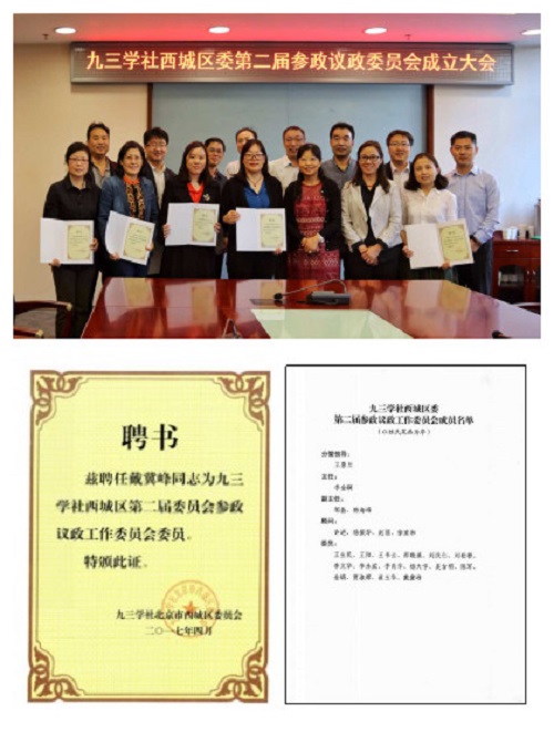 4月26日,九三学社西城区委第二届参政议政委员会召开成立大会,九三学社西城区委主委郑实,副主委魏建新,副主委王景兰,参政议政委员会主任、副主任、顾问及部分委员参加了会议。会上,我校金年会官网(以下简称土木学院)副教授戴冀峰,被聘任为第二届参政议政委员会委员。