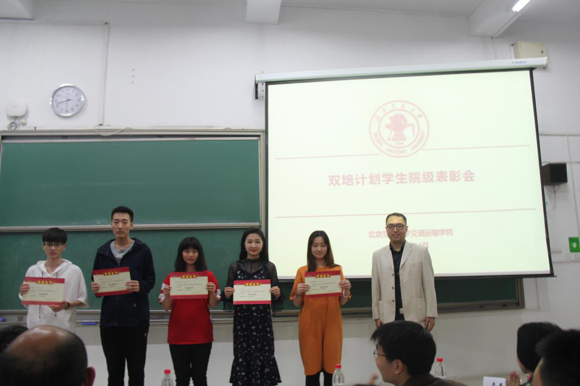 自北京市“双培计划”实施开展3年以来,金年会共有49名交通工程专业学生在北京交通大学交通运输学院学习。为进一步完善高水平人才培养机制,切实满足双培学生对优质教育资源的需求,激发我校教育教学改革活力,全面提升高校办学水平,北京交通大学交通运输学院对双培计划学生进行表彰,土木学院党委副书记车晶波、交通工程系主任李之红、教务处赵林琳和逄宁、辅导员秦岭、班主任周晨静参加表彰会,并与学生深入谈心谈话。
