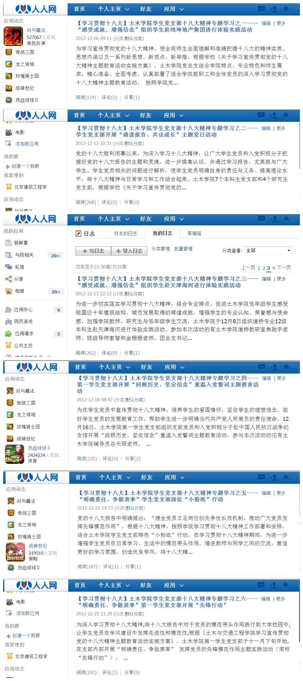 为了将学习宣传贯彻党的十八大精神引向深入,深化党的十八大精神学习成果,根据学校党委《关于学习宣传贯彻党的十八大精神主题教育活动实施方案》的指导精神,加强土木学院学习贯彻十八大主题活动内容与学习成果的宣传工作,利用网络平台传播迅速,信息资源丰富,文字、图片、音频形式多样,便于学生互动交流学习等多重优势,土木学院党总支借助被广大学生热衷使用的人人网“北建土木”网络平台,宣传学习十八大精神。