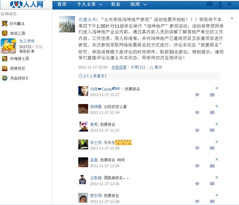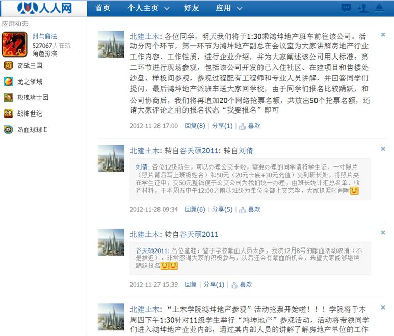 “北建土木”发表的任何状态、日志和图片均具有供好友评论的功能,同时,作为好友的同学之间也可以互相评论,在“北建土木”宣传土木学院十八大精神学习专题期间,同学们通过评论将活动成果日志重点推荐给自己的好友,在活动前期宣传状态上提出自己的疑惑,网络报名的环节邀请并帮助本班同学报名,发现活动日程安排的不合理之处等等。“北建土木”在十八大精神学习主题活动的宣传过程中,为土木学院师生提供了一个交流互动的平台,使学院在组织活动的时候能够迅速发现活动安排中存在的问题,结合学生反馈情况,逐步提高土木学院的活动成效。