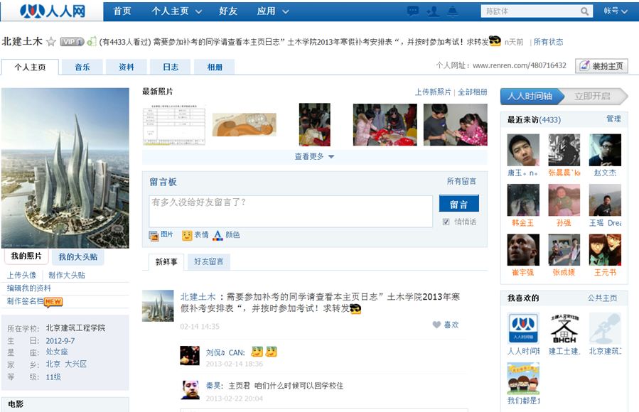 以期充分利用互联网做好大学生思想政治教育工作,提高学院学生工作与服务水平,土木学院借助人人网,创办了 “北建土木”人人网主页。“北建土木”目前拥有好友643人,涵盖了土木学院全体学生党员、部分入党积极分子、学生干部、大部分低年级学生,全体学生工作教师、部分班级导师等。自创办以来,“北建土木”以温馨亲切、形式多样的表达方式,在学风建设、教务信息、学术知识普及、新生入学教育、学生骨干培训、大学生科技竞赛、奖学金评定、学生资助、学生文体活动、学生社会实践活动、学生宿舍管理等有关学生工作的诸多方面起到积极的宣传、引导和促进作用。