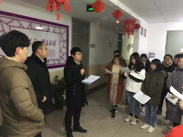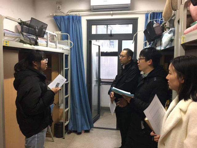 12月7日下午,土木学院党委副书记车晶波带队,学院全体辅导员老师和15位同学代表组成的评分团进入各宿舍对宿舍文化建设等方面进行现场打分。每间宿舍都各具特色,有的宿舍门上挂有绿植作为装饰,有的挂着小黑板记录知识点,有的同学用墙纸海报装饰自己的空间。在对宿舍文化建设讲解这一环节中,土172班419宿舍长闫少佳说到,每周她们都有固定的集体活动,英语原声电影之夜,是她们四六级高通过率的秘籍,答题解惑之夜,帮助她们学习成绩名列前茅;材161班421宿舍长覃铃玲说到,宿舍成员都有各自擅长的运动项目,在体育锻炼中,培养了她们之间亲密无间的感情。