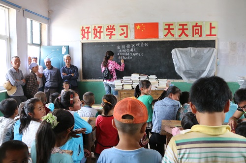 在当地志愿组织协助下,实践团成员们将书搬到教室,和宿舍一样大的教室中摆着五张桌子,教室的一角放着翻得很旧的课本与习题。孩子们整齐的坐在书桌后,没有座位的小孩安静的站在教室中间。略显生涩的而又充斥着好奇的双眼齐刷刷的望着你,让你心中再坚硬的地方也会柔软下来。把书本分发给他们,每个人的脸上都洋溢着笑容,吵闹了一会儿,便就投入进自己手中的书本。没有想象中的争抢或者不满意,每个人手中的书本就想宝贝一样被他们每个人珍惜,是他们的生活环境送给了他们“珍惜”这份宝贵的礼物。在当地的捎书信使用家乡话和孩子们说明来意,告诉他们这些书都是捐给他们的,他们的脸上在短暂的沉默后都露出兴奋的笑容。术川小学田校长告诉孩子们,捐书信使上大学后又回报家乡,鼓励孩子们要好好学习,考上大学后像大哥哥大姐姐一样回报家乡。