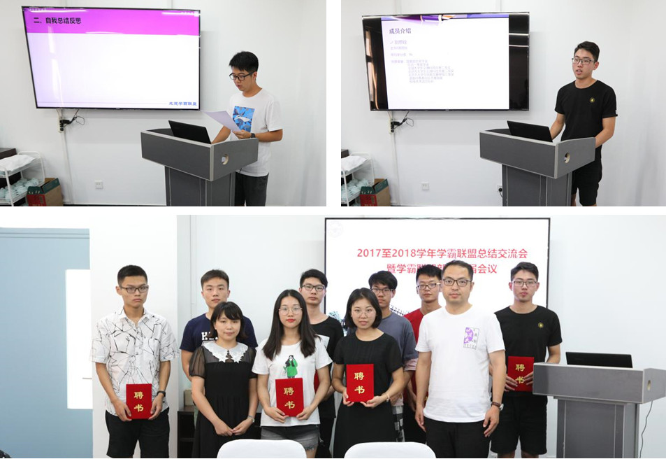 会上,原社长杨杰川就学霸联盟2017-2018学年的工作情况进行了汇报,他全面总结了学霸联盟过去一学年的工作,并客观地剖析出社团在工作上的不足。随后,现任社长刘思铨对本年度社团的工作进行展望:从学霸联盟的部门设置,到各部门的分工、对授课部的工作的整体规划方面,描绘了他眼中联盟的蓝图,并宣读各部门的人事变动。
