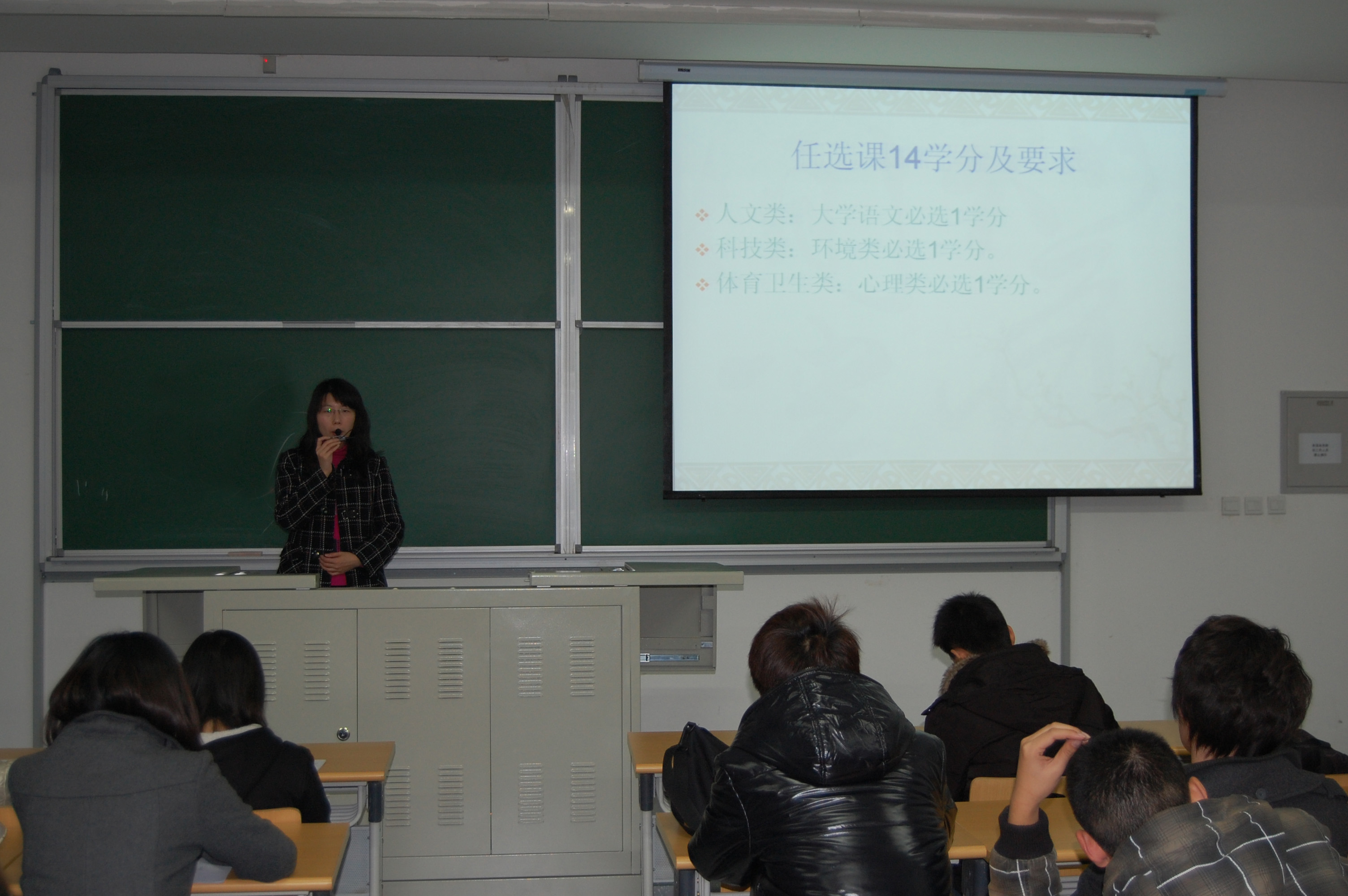 2011年11月23日下午,金年会官网逐班举办了2010级学生学籍管理制度专题讲座。金年会官网党总支副书记朱静,教务员孟庆东和全体大二学生参加了培训讲座。