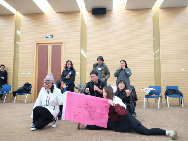 活动的第一部分热身是通过特定的情景想象,缓解了刚见面的紧张和尴尬。“剪刀石头布接龙”和“勾肩搭背操”等趣味性很强的热身活动也引导着大家进一步融入本次培训。