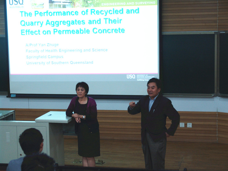 诸葛燕教授分别从可渗透混凝土和自然纤维面板结构两个方面的研究,向大家讲解了当前澳大利亚在透水混凝土与自然纤维面板结构的研究进展情况,并指出在这些研究过程中出现的一些问题和难点,同时给予深入分析,进一步加深了与会人员对透水混凝土和自然纤维面板结构的认识。最后,诸葛燕教授还就联合培养留学博士生提出一些意见。会上,与会的老师、同学们积极与诸葛燕教授进行交流互动。诸葛燕教授严谨的治学态度以及认真踏实的工作作风给老师、同学们留下了极其深刻的印象。
