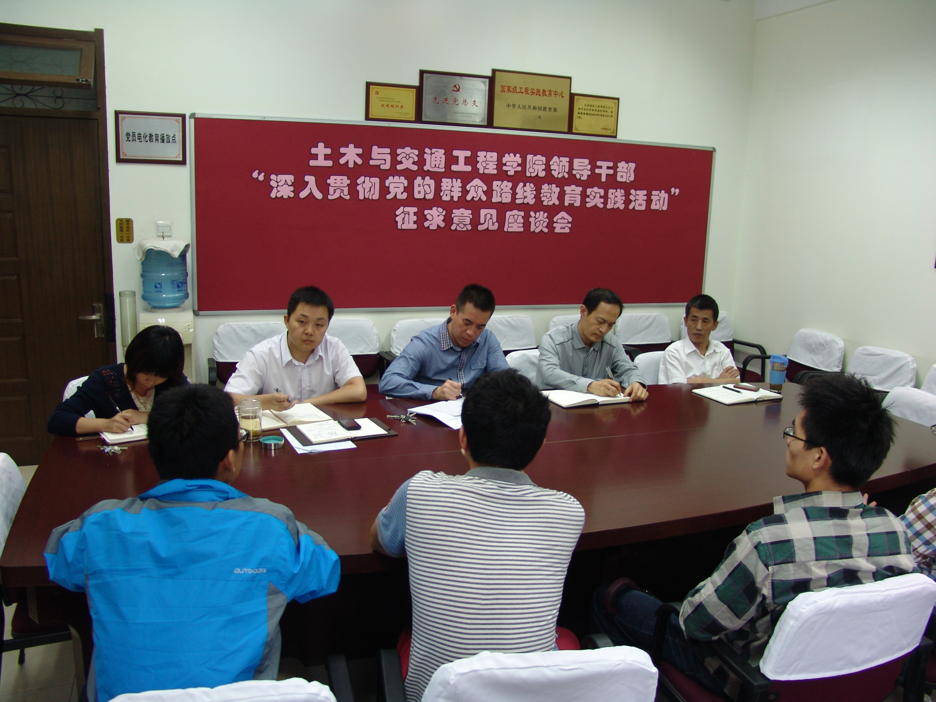 9月17日下午,金年会官网(以下简称“土木学院”)在教一112会议室召开第四次领导干部“深入贯彻党的群众路线教育实践活动”征求意见座谈会。学院领导班子成员何立新、戚承志、龙佩恒、王秉楠,团总支书记刘倩出席此次会谈,20名本科及研究生代表参加此次会谈,会谈由学院党总支书记何立新主持。