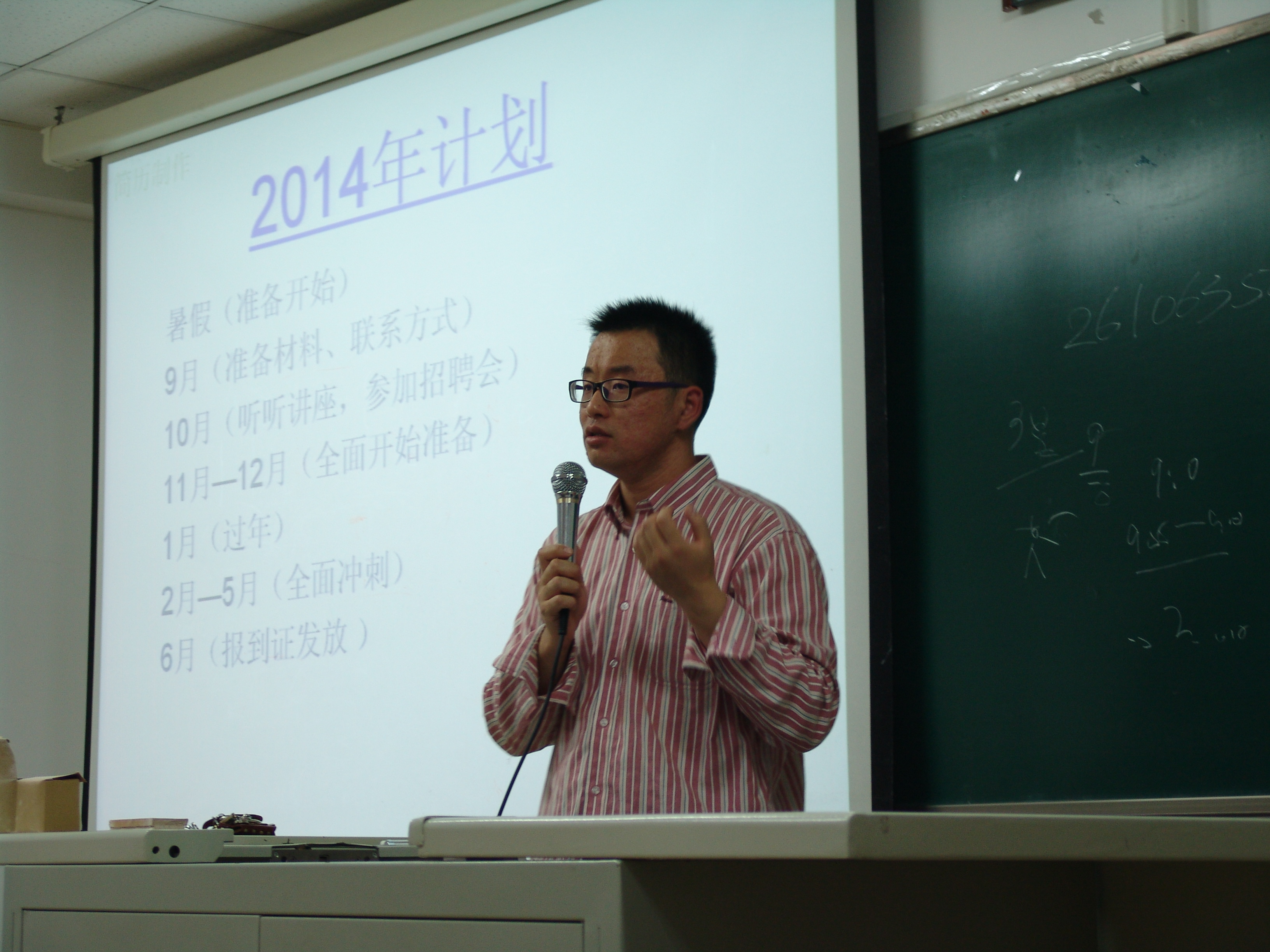 王子岳老师对结业前的方方面面准备工作做了细致的讲解,紧密围绕与研究生就业相关信息获取、应对技巧提出四点建议:1、网投简历技巧;2、制作简历内容,注重自己专业能力,学习能力和创新能力;3、2014年计划和时间安排;4、获取信息途径,包括网络信息、政策文件、亲朋好友和公告栏。