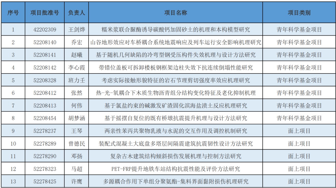 2022年国家自然科学基金集中接收申请项目评审中,土木学院获批项目13项,包括5项面上项目和8项青年科学基金项目。这是学院连续两年在获批项目上取得突破性进展,暨2021年获批12项达到历史最高,今年则再次刷新了记录!