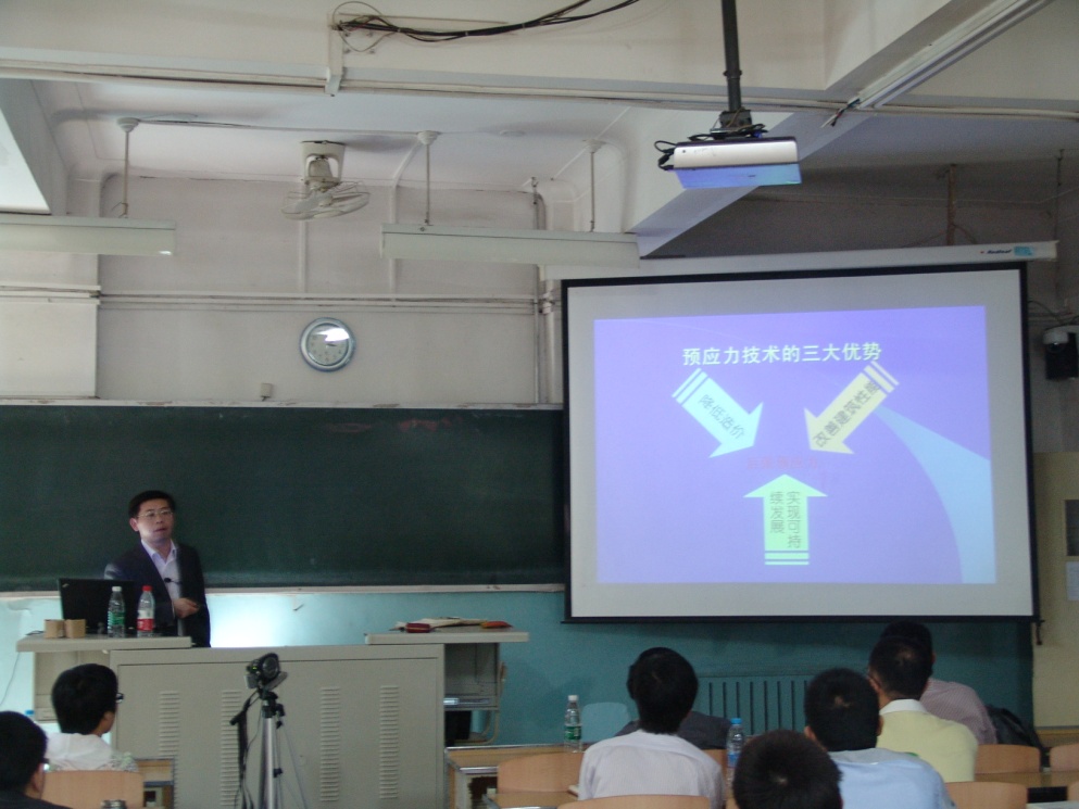 许曙东总工在讲座中向师生介绍了预应力结构,并从预应力混凝土、预应力钢结构等几个方面详细介绍了各自的特点及具体的工程实例,加深了同学们对预应力结构的理解。在讲解过程中还以我校大兴校区的综合楼为案例,详细介绍其结构特点和预应力在其中的具体应用。其讲座深受听课老师和同学的喜爱,大家都聚精会神的倾听许总的讲解,与会人员对报告内容进行了热烈的讨论,提问问题非常积极,许总也热情地回答了老师和同学们的提问。
