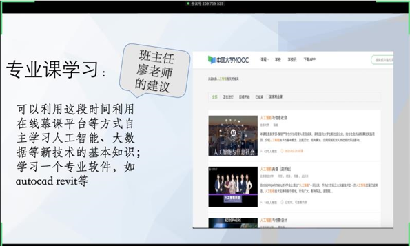 紧接着,智建191班的宣传委员赵若涵同学宣读了教育部、北京市和学校的相关文件要求,将各个部门的防疫精神从不同层面准确地传递给了大家,并代表同学们向学校发出承诺,打赢防控攻坚战,智建人在前方!学习委员赵文漪同学向同学们分享了新学期线上课程学习计划,她将线上课程的学习安排、自己的在线上课程学习计划以及学校的体育锻炼安排与自己的锻炼计划分享给了大家,发挥了学习委员的带头作用,让同学们意识到了在家学习的必要性。