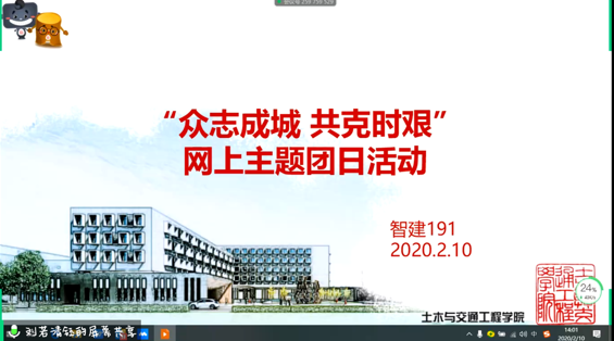 2月10日,土木学院智建191班作为全校示范班级召开了线上示范性团日活动。本次示范性团日活动以“众志成城 共克时艰”为主题,深入贯彻习近平总书记重要指示精神和北京市对疫情工作的重要部署,落实学校疫情防控工作安排,引导学生积极抗击疫情,锤炼意志品行,努力提升自我。参加线上主题团日活动的有土木学院党委书记冯宏岳、副书记车晶波、班主任廖维张、校团委组宣部部长刘倩、辅导员秦岭、苑泉、李辉、李鑫、余静、苗胜杰、智建191班全体同学、19级各班班长支书,学院团学骨干共96人参加活动。