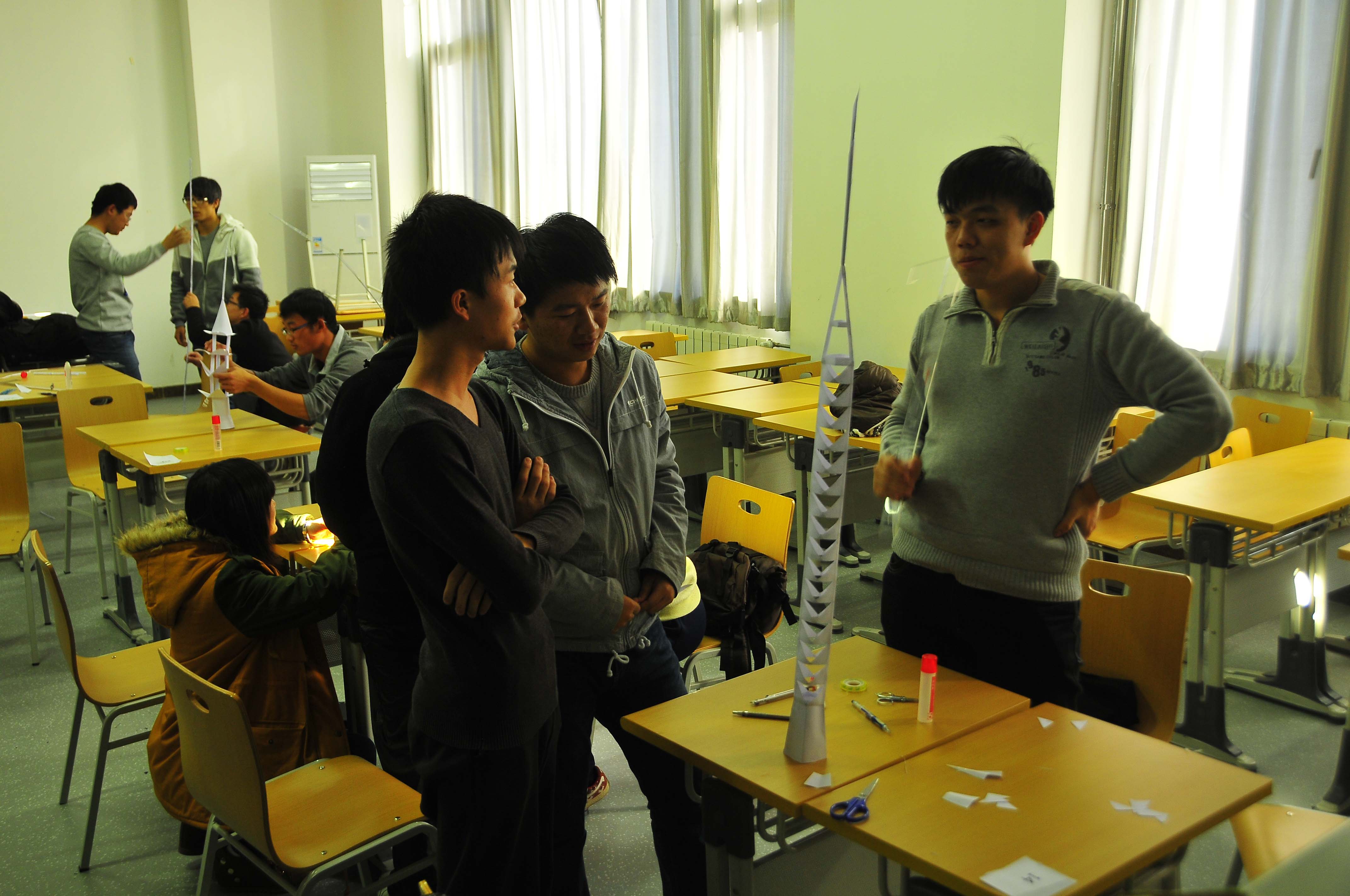 土木学院举办的“纸楼”设计大赛是主要针对我校低年级学生、按照市级以上结构设计类竞赛比赛模式开展的学生课外科技活动,比赛意在培养低年级学生的专业兴趣,提高学生的结构设计理念,加深学生的专业认识,加强学生的动手能力和团队协作能力,使低年级学生对结构设计类比赛具有初步认识。在比赛开始之初,朱静老师首先对所有参赛选手发表讲话,鼓励大家学好专业课并积极参加各类建筑设计大赛,多积累比赛经验,为明年的北京市级以及全国性质的大赛做准备。随后,各个参赛小组在分会场开始进行模型制作,根据比赛规则,各小组需要在25分钟之内使用两张A4纸完成“纸楼”的制作;然后,由比赛组织人员对“纸楼”模型进行高度测量;最终,各参赛队派代表到主会场进行现场模型讲解,并由各位评委按照模型高度、美观与讲解三项标准进行评分。经过激烈的比赛,共有二十六组完成比赛任务,最终角逐出一等奖一名,由土木学院12级贲成,赵鑫,赵阔,崔长坡组获得;二等奖两名,分别由张豫湘组和刘鸣组;三等奖三名,分别为吴鹏志组,刘宣佑组和贾子存组,以及最佳美观奖和最佳演说奖各两名。最后由各评委为获奖小组进行了颁奖。