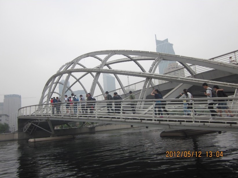 上午十点半我们乘车来到了风景秀丽的天津海河沿岸,在正式参观之前,焦驰宇老师为11级学生讲解了有关桥梁结构的基本概念,然后在研究生的带队讲解下开始了本次专业认知参观活动。本次参观的第一站为海河上具有85年历史的解放桥,解放桥是一座双叶立转式开启式钢结构桥,桥梁可以从中部开启通航,历经风雨的解放桥见证了天津城市的发展与变迁。随后,我们沿着海河参观了坐落于天津市中心城区的中央金融商务区的赤峰桥,赤峰桥的外观犹如一艘在海上行驶的游轮,该桥也是国内唯一一座斜塔双索面弯斜拉桥。接下来我们来到了具有欧式装修风格的大光明桥,大光明桥的桥头安装了象征“日、月、星、辰”具有浪漫写实主义色彩的雕塑。然后,我们徒步到达金阜桥,金阜桥具有空间网状拱结构的独特造型,桥梁整体给人以轻盈、灵动的感觉。金阜桥的南侧为直沽桥,直沽桥为三跨连续中承式无推力拱桥,拱与拱之间用独特的“花瓣”结构连接成一个稳固的整体。本次活动参观的最后一座桥为大沽桥,大沽桥是一座不对称外飘式联合梁系杆拱结构桥梁,美丽的大沽桥曾获美国世界桥梁大会“尤金•菲戈奖”。