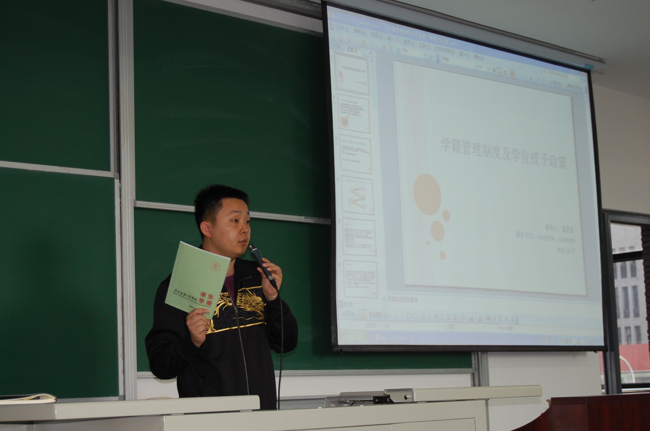 土木学院团总支书记王秉楠老师首先为大家简单介绍了大学四年的任务和培养计划,提醒新生认真阅读新生手册,安排好大学四年的学习与生活。随后,学院教务员孟庆东老师为大家细致而全面的讲解了我校有关学籍管理和学位授予制度。孟庆东老师在专题讲座开始之前先为新生介绍了教务处和教务员老师的有关职责,让大一新生对大学的教育教学管理模式进行一定的了解,然后孟老师针对我校本科生学业修读管理规定,学籍管理中有关学生考核标准、转专业、留(降)级、退学与试读、休学与复学、学籍处理等内容,学生考勤管理办法,学位授予等涉及学生学籍学位等内容进行了详细的讲解。讲座现场气氛轻松、活跃,同学们认真倾听,并在现场针对重点问题和老师进行交流互动。