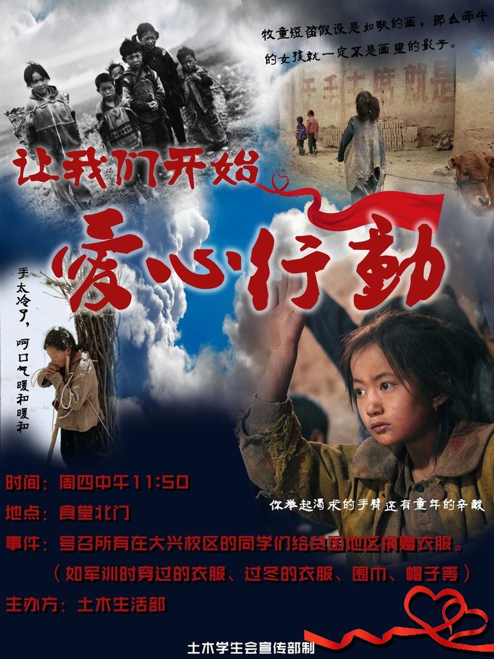 2012年10月18日至11月1日,金年会在食堂北门如约举行为期两周的以“情系山区孩子,爱暖天上人间”为主题的爱心捐助活动。活动由金年会学生会生活部主办,众多同学参与其中。