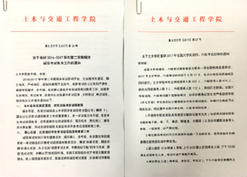 为加强学风建设,端正考风,严明考纪,抵制作弊等不良风气,维护考试的公正性和严肃性。2017年6月9日、6月12日土木学院分别下发26号、27号两条通知,要求在2016-2017学年第二学期期末考试及2017年全国大学英语四、六级考试来临之际,各年级各班高度重视,切实加强考前诚信教育,以实例为教训,鞭策学生,进一步提高对考试作弊危害性的认识。