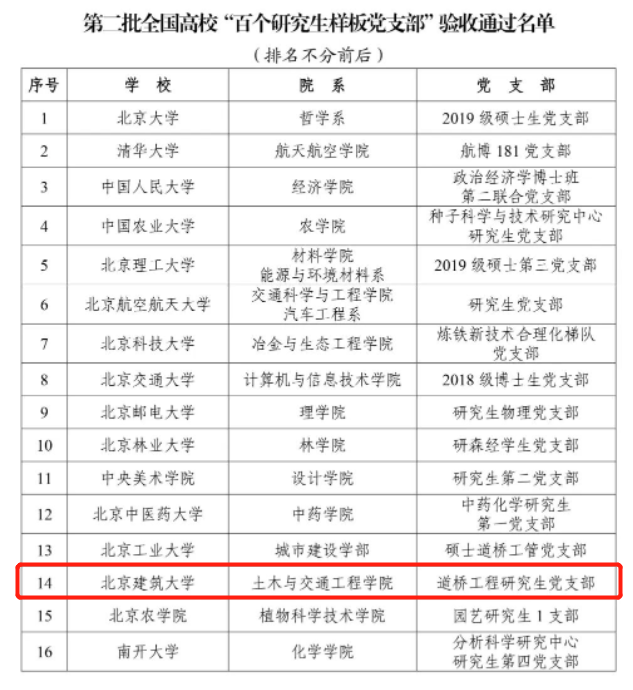 近日,教育部思想政治工作司、教育部学位与研究生教育发展中心联合公布了关于第二批全国高校“百个研究生样板党支部”和“百名研究生党员标兵”创建培育工作验收结果。我校金年会官网道桥工程研究生党支部和研究生党员陈越全部通过教育部验收。