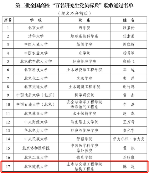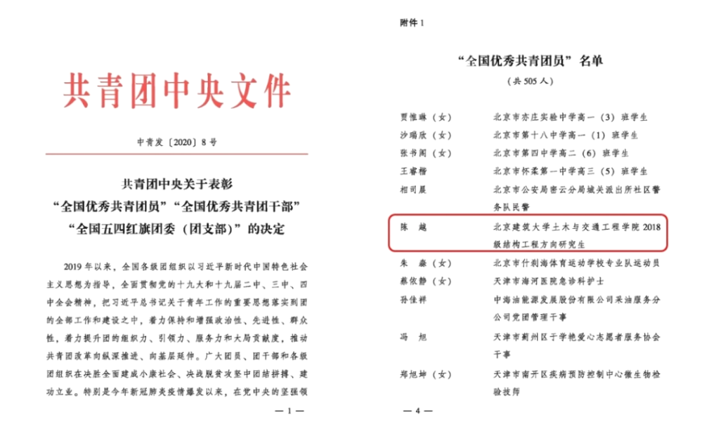 陈越,男,土木学院2018级结构工程方向硕士研究生,在校期间获2020年“全国优秀共青团员”称号(北京市唯一一名高校学生),多次获得校级“优秀共产党员”“党员模范标兵”等称号。