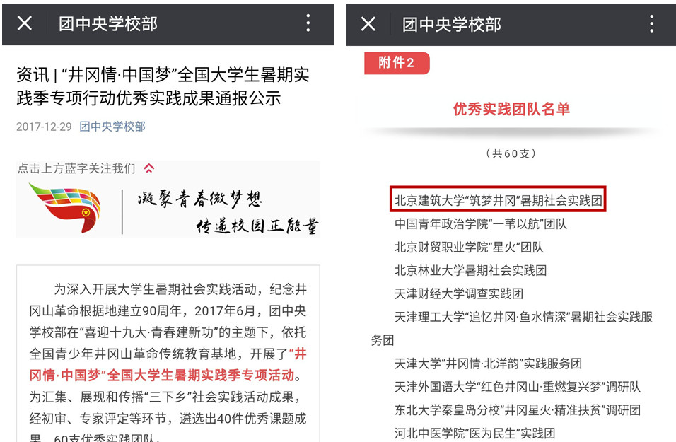 为纪念中国共青团成立95周年、井冈山根据地建立90周年,团中央学校部携手全国青少年井冈山革命传统教育基地开展“井冈情·中国梦”全国大学生暑期实践季专项活动。在校团委的支持下,我校 “筑梦井冈”实践团从全国536所高校、726个实践团队中脱颖而出,于2017年8月下旬再次来到这片红色的土地,重拾红色记忆,追寻属于我们建大学子的青春梦、井冈梦。