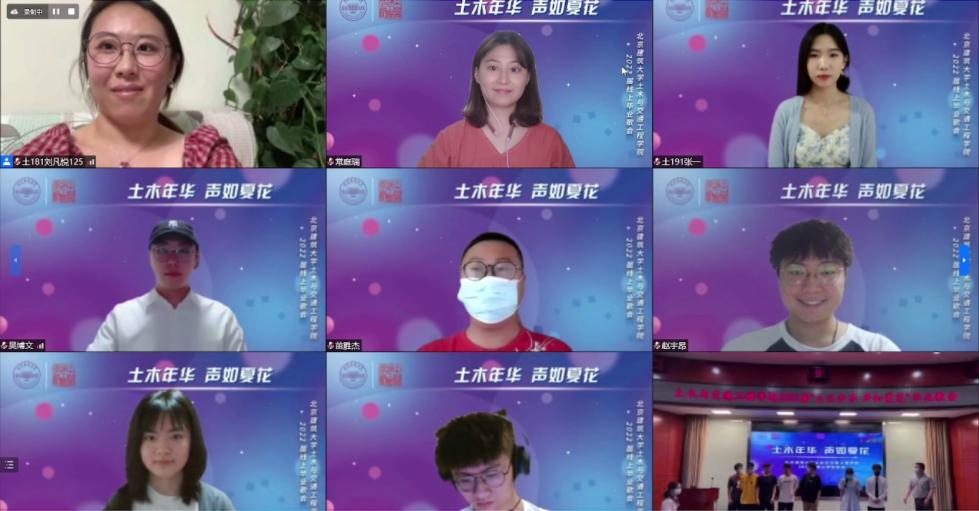 待到凤凰花开季,惟愿前程皆似锦。四年美好时光即将结束,新的梦想即将启程。为欢送2022届毕业生,6月19日晚19:00,土木学院举办“土木年华·声如夏花”2022届线上毕业歌会,为学生上好毕业季美育思政课。校团委书记、党政办副主任卫巍,土木学院党委书记韩淼,校团委副书记李阳,土木学院党委副书记李红,土木学院党委副书记关海琳,相关部门老师以及各年级辅导员,2022届毕业生共460余人参加歌会。歌会由土183班吴博文、土187班常庭瑞、土191班张一主持。