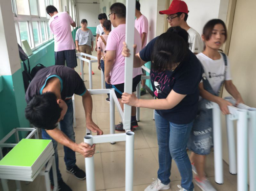 在龙门与柳树底共建时,不仅需要整理图书,还要将然尔捐赠的桌椅板凳拼接安装好,多了的是任务,少不了的是热情,实践团的队员们一箱箱地搬桌凳腿,拆封,划开保护套,拼接,有的杆件不容易咬合,队员们就用桌腿使劲砸咬合处,一张桌子安置下来,几个人头上都冒出了密密的汗珠......