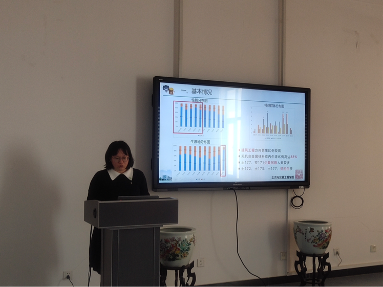 李鑫就17级各班学业成绩、四六级通过率和毕业去向做了详细的分析和梳理。同时,经过对比两次毕业去向摸底调查结果发现,学生的毕业去向逐渐固定,就业意向比率有所增高。