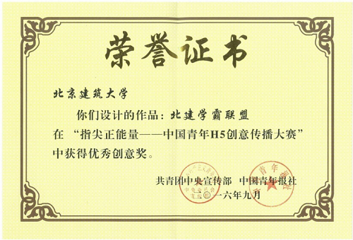 H5创意传播大赛分设社会组、学生组两个类别。自4月中旬启动以来,共有千余个H5团队提交的3000余份作品参赛,其中40件作品荣获优秀创意奖。作品“北建学霸联盟”由秦岭老师作为指导老师和土木学院学霸联盟组成的参赛队设计,理念新颖,视角独特,以学霸联盟正能量的活动宗旨作依托,互联网为传播媒介,展现了建大学子积极向上的精神面貌。经历初选、网络投票、专家评审等环节,最终获得本次大赛学生组优秀创意奖。