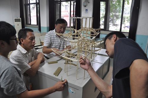 指导会上,3名参赛学生经过上一次赛前指导之后,严格按照专业教师的指点,又成功完成4个建筑模型的制作。将模型的优点继续的保留下来,模型制作过程中的缺陷逐步在制作模型过程中修改和完善。整体模型设计思路有了巨大的完善和创新。不仅在加载过程中配重实现了新的突破,而且模型整体质量有了大幅度的降低,实现从第一个模型700余克的质量减到最后一个模型只有130克质量的质的突破。同时,参赛队员也将团队制作模型过程中所遇到的问题和困难与指导老师进行了交流。龙佩恒老师对这几次参赛队员制作模型能力的进度速度十分认可,韩淼老师、王秉楠老师、祝磊老师希望在赴赛前的几天时间内进一步熟悉制作环节,熟练操作过程,利用不多的几天备赛时间多加练习。刘栋栋教授、赵东拂老师从具体设计细节、模型质量等方面给出建议,“顶层悬臂构件的设计需要完善;模型质量不能一味的降低,首先要保证模型能够顺利通过加载环节……”。夏萌、王霖和王申禹3名学生也表达了有必胜的决心参加此次比赛。