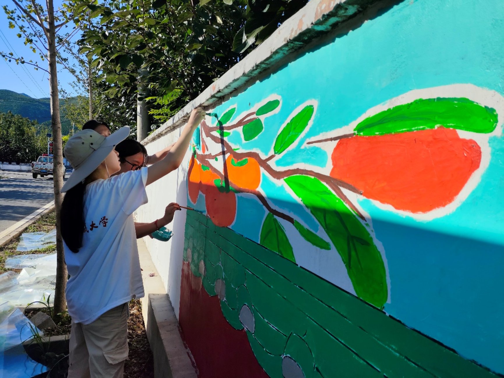 经过前期多次实地调研,了解当地村委干部、村民的意见想法,想出要利用文化墙展示大峪沟村地域文化,更好地为大峪沟村“磨盘柿”产业发展服务,宣传“磨盘柿”品牌,实践团决定以“和美柿村”为主题进行当地村落的墙画设计。