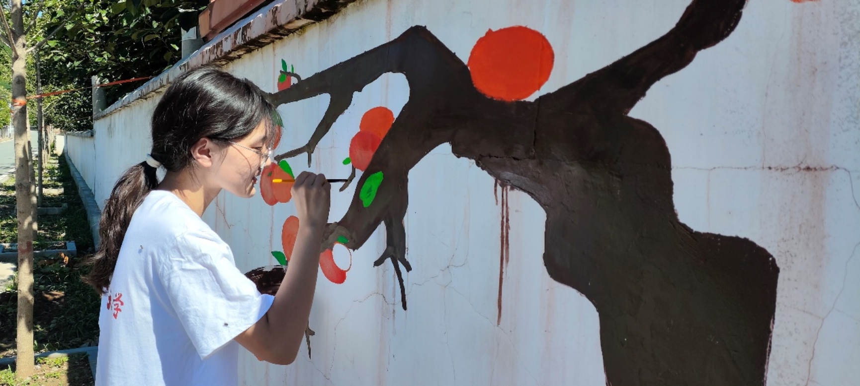 活动当天,实践队员们顶着38℃的太阳,有序做好绘制工作,一笔一划用心勾勒、一勾一点精雕细琢,让一幅幅和美乡村画卷为原先空白的墙壁穿上了新衣。