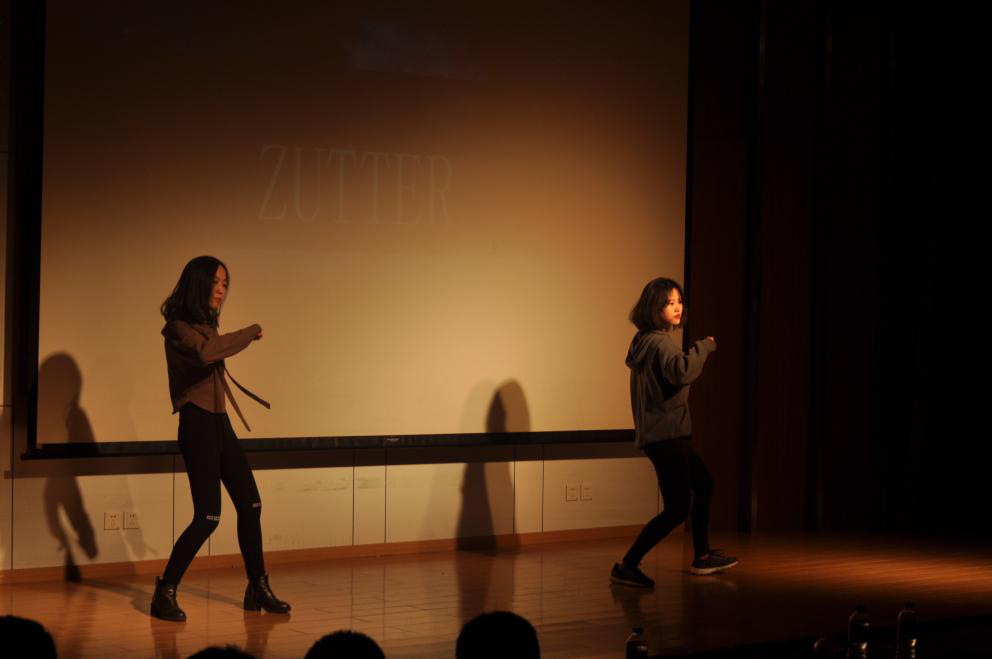 男生的街舞表演精彩动感,姑娘们也不甘示弱,由黄一颖、杨秋惠同学带来的舞蹈 《zutter》婀娜多姿、青春艳丽。