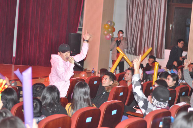 紧接着,段嘉洵带来说唱歌曲《lose youself》,节奏欢快,在台上表演一次后,观众似乎还不尽兴,段嘉洵走下舞台再次演唱了一遍,并与观众拍手互动,晚会现场气氛进入高潮。