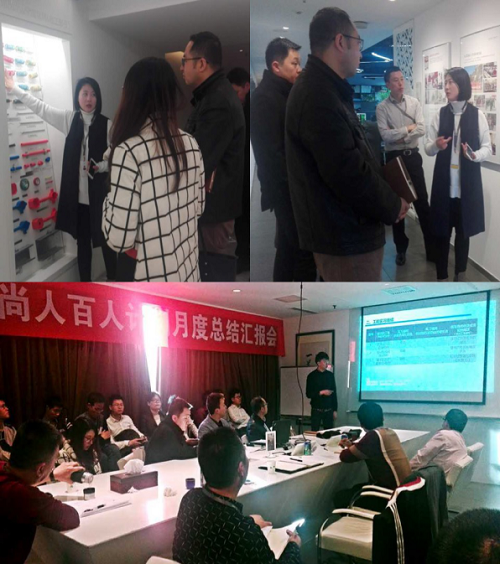 在走访调研的过程中,老师们就尚层装饰对于人才的需求和选人用人的标准进行了深入了解,双方就如何搭建学生实践平台以及未来合作方向定位进行了深入探讨。会后,尚层装饰的工作人员带领各位老师参观了他们公司的工作环境,材料展示区以及企业文化,并有幸观摩了我校签约尚层装饰的2017届毕业生实习生月度总结汇报。通过观看资深专业人士对他们指导与点评,我们看到了实习生们的成长与蜕变。学生们只有走进企业生产的一线,只有把书本学到的知识应用于实践,并接受专业人士的指导,才能像那羽翼丰满的雄鹰,展翅翱翔于蓝天。