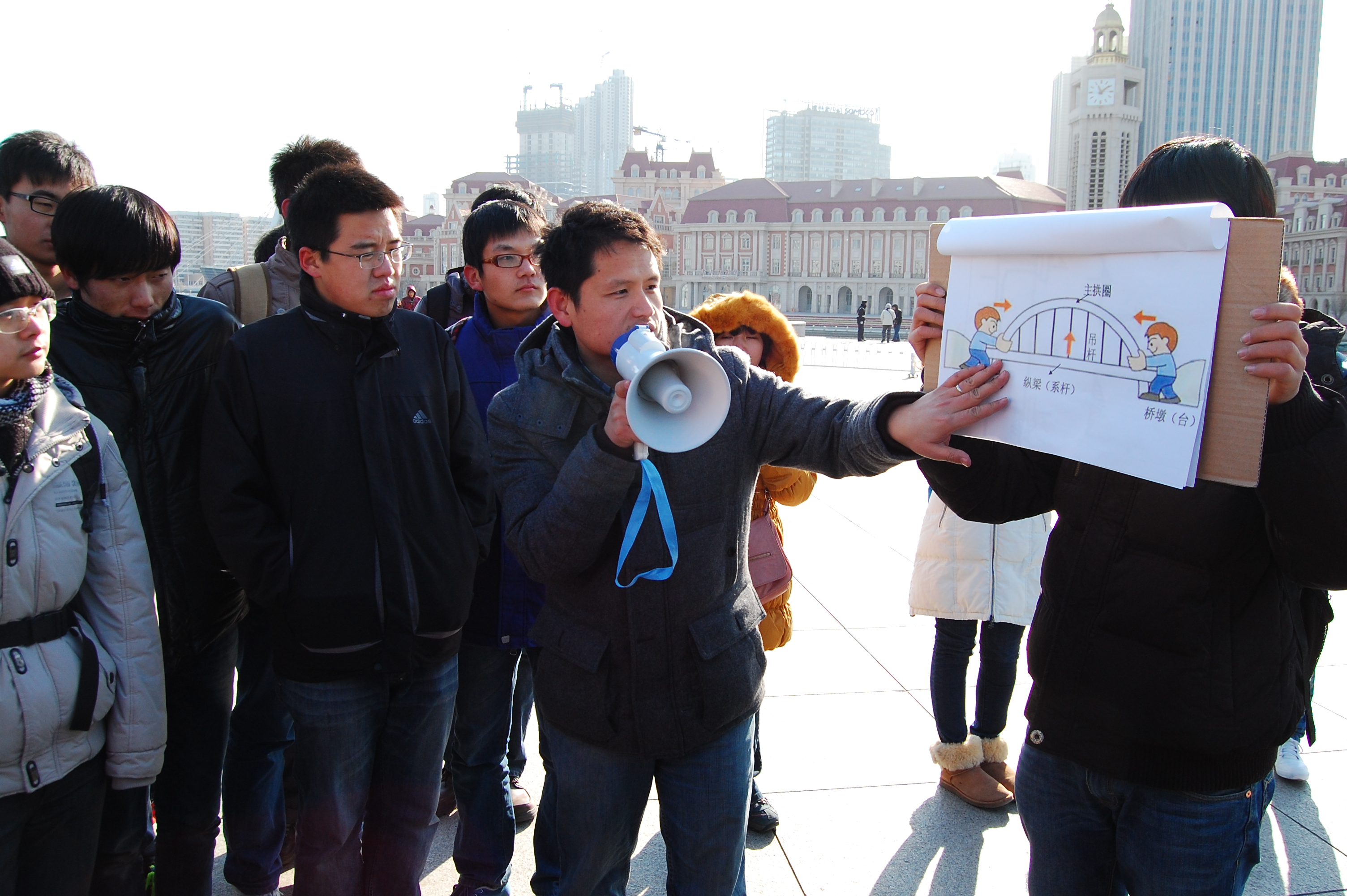 上午十点半我们乘和谐号来到了天津海河沿岸,虽然天气寒冷但并没有减退同学们参观体验的热情。在正式参观体验之前,焦驰宇老师为12级学生图文并茂的讲解了天津近十年间城市的发展、天津海河上桥梁的概况以及桥梁结构的基本概念。其后,在研究生的带队讲解下开始了本次体验实践活动。活动的第一站为海河上具有85年历史的解放桥,解放桥是一座双叶立转式开启式钢结构桥,桥梁可以从中部开启通航,历经风雨的解放桥见证了天津城市的发展与变迁。随后,我们沿着海河参观了由世界著名桥梁设计大师邓文中院士设计的大沽桥,它是一座至今为止世界上独一无二的不对称外飘式联合梁系杆拱桥,该桥设计构思新颖、独特,寓意“日月同辉”,曾获美国世界桥梁大会“尤金·菲戈奖”,体现了我国当代桥梁结构设计施工的较高水平。然后,同学们来到了具有古典建筑风格的北安桥,北安桥桥头雕塑采用西洋古典表现形式,吸取中国传统,青龙、白虎、朱雀、玄武寓意东南西北四方平安,桥墩雕像为青铜正面装饰盘龙,桥栏柱基上为四尊舞姿各异的乐女、金光闪闪,造型高贵典雅。最后,同学们在老师的带领下来到了天津意大利风情区,它曾经是天津的意大利租界,但伴随着祖国的复兴,它已经成为集旅游、商贸、休闲、娱乐和文艺为一体的综合性多功能区。