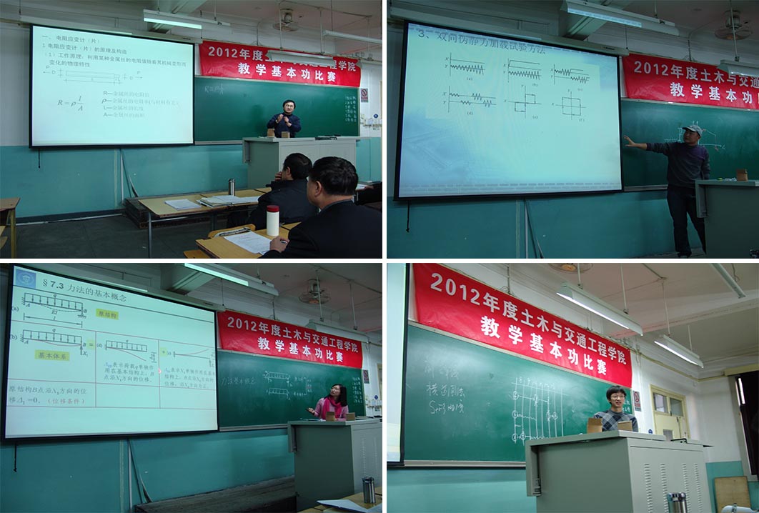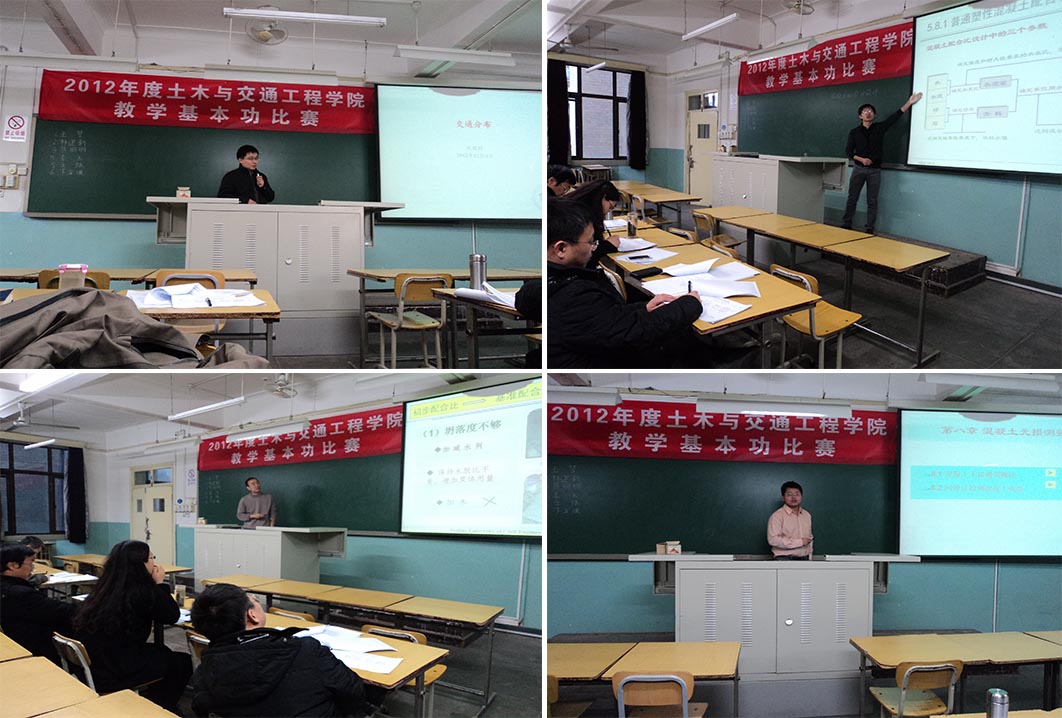 为加强金年会官网(以下简称土木学院)青年教师(35岁以下)培养,增强新、老教师在教学方法等方面的交流,展现青年教师风采,检验青年教师教学基本功水平,促进教师积极主动地提高自身的教学能力,2012年12月4日,金年会官网在教1-323和教1-326教室举行了2012年度青年教师教学基本功比赛。