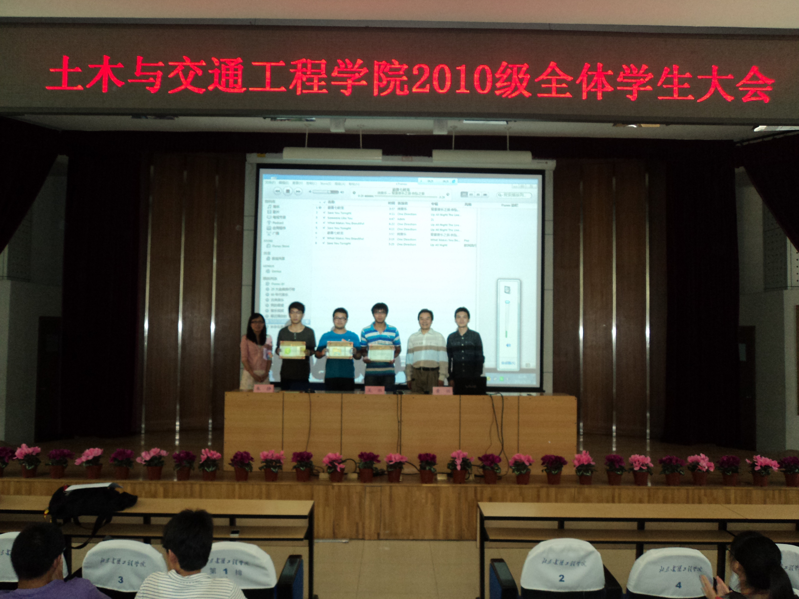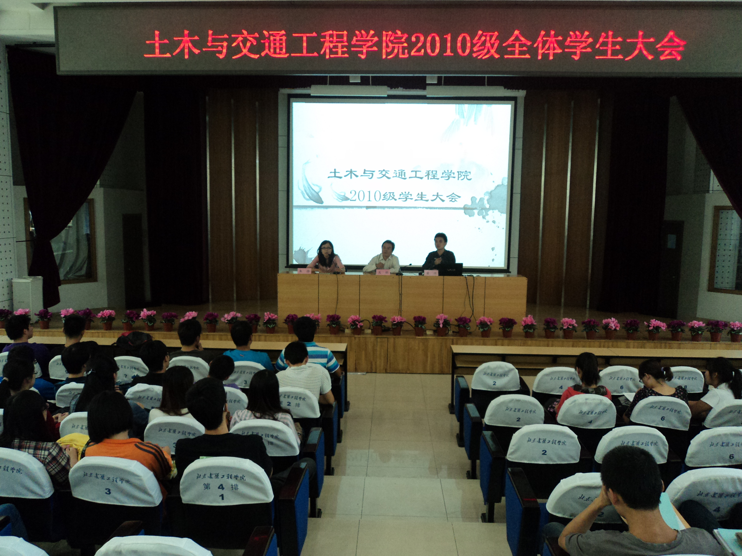 2012年9月19日中午12:00,土木学院10级全体学生在第二阶梯教室召开2010级全体学生大会。土木学院院长吴徽老师、党总支副书记朱静老师、10级辅导员黄兴老师出席了本次大会,大会由朱静老师主持。
