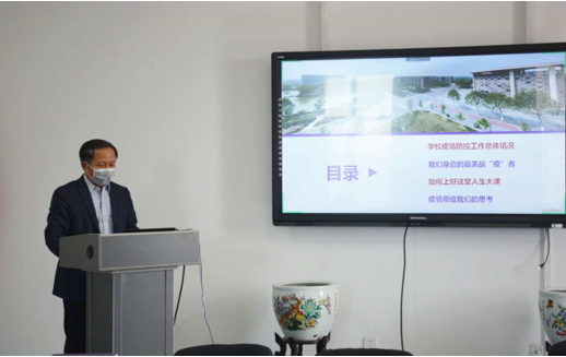 张大玉副校长在介绍全国疫情防控形势时指出,我国疫情防控工作在习近平总书记“生命重于泰山,疫情就是命令,防控就是责任”指示下分体现了中国特色社会主义的制度优势、组织优势、政治优势,目前疫情防控形势积极向好的态势发展。
