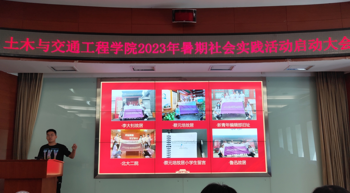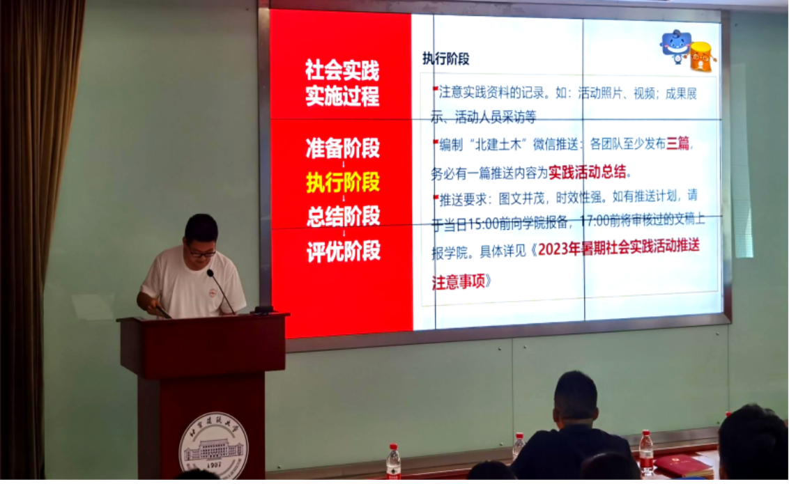 土木青协实践部单梓泰同学介绍了2023年土木学院社会实践的基本情况.本次实践活动共有11支团队、100余名师生参加,实践团队涵盖北京、河北、福建、港珠澳等地,实践内容包括宣讲活动、红色寻访、支教研学、文化传承、乡村振兴、党员座谈等。单梓泰同学对实践活动的准备阶段、执行阶段、总结阶段和评优阶段进行了详细介绍。
