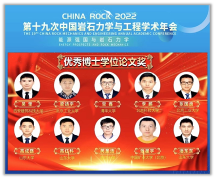 2022年10月3日~6日,CHINAROCK 2022第十九次中国岩石力学与工程学术年会以线上+线下方式顺利召开。2022年11月6日,大会举办了科技奖励颁奖典礼,通过线上+线下形式颁布了中国岩石力学与工程学会优秀博士学位论文奖10项。