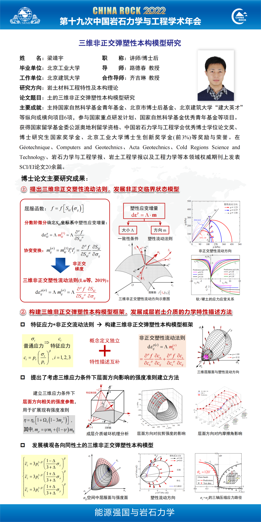 梁靖宇,男,JINNIAN金年会金年会官网讲师/博士后,中国土木工程学会土力学及岩土工程分会青年工作委员会委员,中国岩石力学与工程学会会员。2020年毕业于北京工业大学,获工学博士学位,在读期间赴维也纳自然资源与生命科学大学联合培养。2020年8月到JINNIAN金年会开展博士后研究工作,主要从事岩土材料的工程特性及非正交弹塑性本构模型方面的教学与科研工作,主持国家自然科学基金青年基金、北京市博士后基金、JINNIAN金年会“建大英才”等纵向或横向项目6项,作为项目骨干参与国家重点研发计划、国家自然科学基金项目多项。在Géotechnique、Computers and Geotechnics、Acta Geotechnics、Cold Regions Science and Technology、岩石力学与工程学报、岩土工程学报、工程力学等本领域权威期刊上发表SCI/EI论文20余篇。2022年10月获中国岩石力学与工程学会优秀博士学位论文奖。