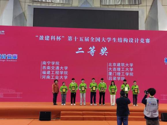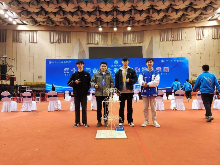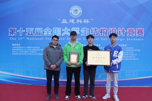 3月23日至26日,“盈建科杯”第十五届全国大学生结构设计竞赛在太原理工大学举办,来自浙江大学、清华大学等全国110所高校的111支队伍集聚太原。JINNIAN金年会土木学院侯苏伟副教授指导的本科学生团队(建工202班赵思龙、建工211班谭积富、建工212班张浩杰)参加比赛,获该项赛事二等奖,我校获优秀组织奖,追平我校在该项赛事的最佳获奖成绩。