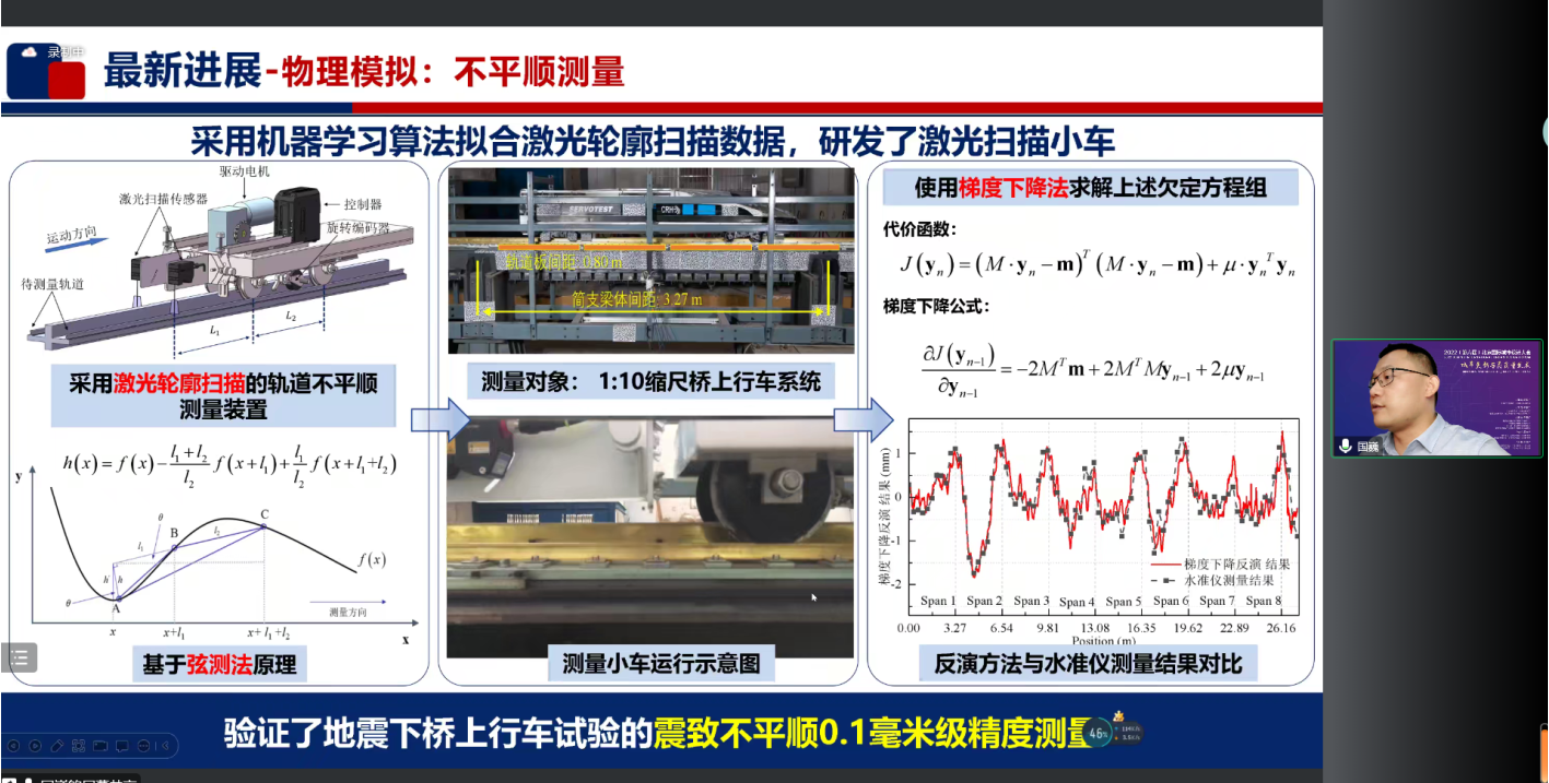 国巍教授做了《地震下高速铁路桥上行车数值与物理模拟技术最新进展》专题报告。报告聚焦于系统地震链式灾变全过程模拟及物理验证难、系统地震链式灾变指标表征难、以及系统地震链式灾变风险防控难等挑战,创新实现了数值仿真与物理试验融合的模拟平台。