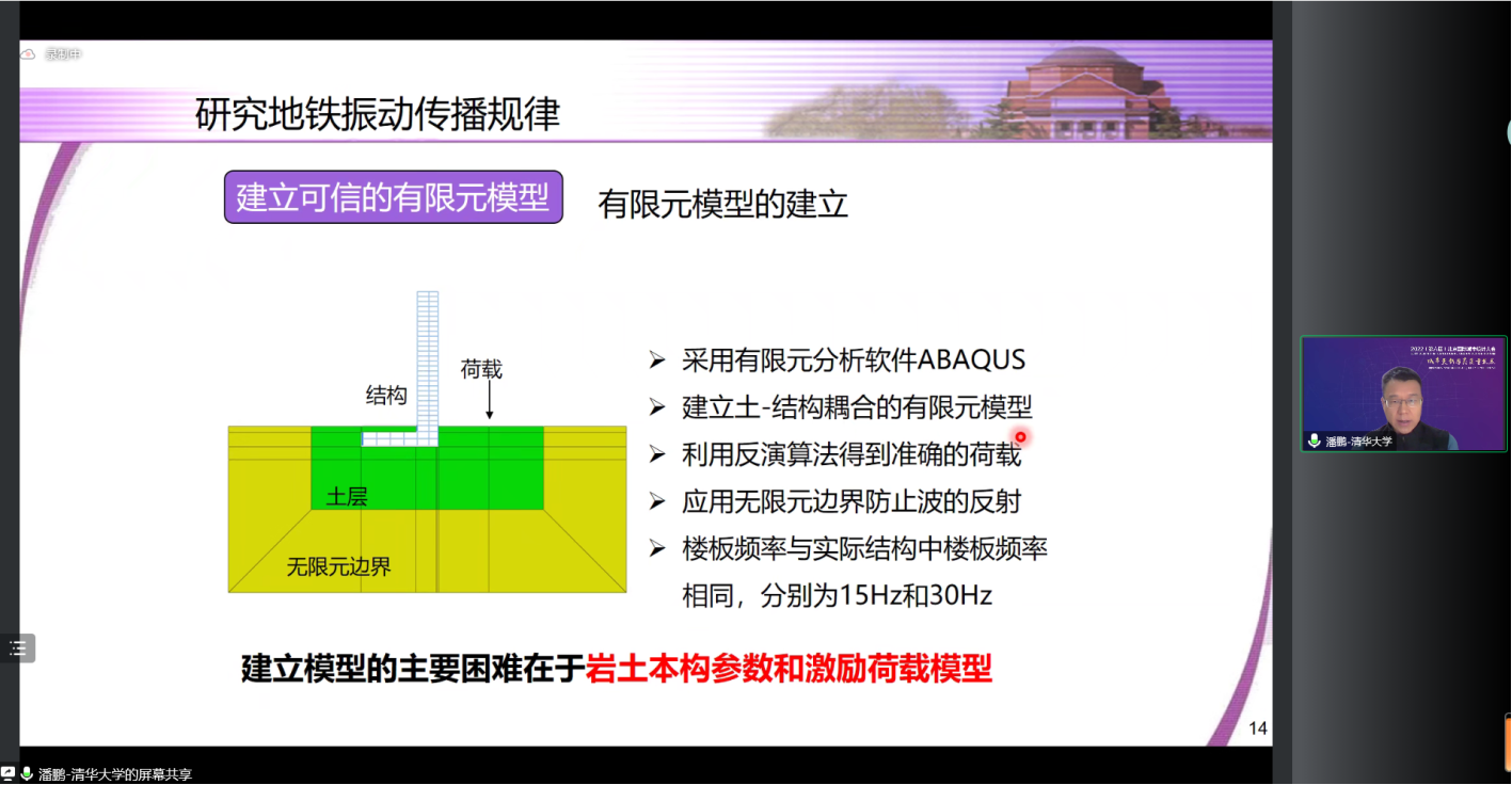 潘鹏教授以《地铁周边建筑隔振方法研究》为题做了报告。他指出通过建立可信的有限元模型研究了地铁振动传播规律,以此研发了隔振器产品,并给出了隔振器设计参数、材料选取和外形设计,并通过试验和数值分析进行了隔振效果验证。