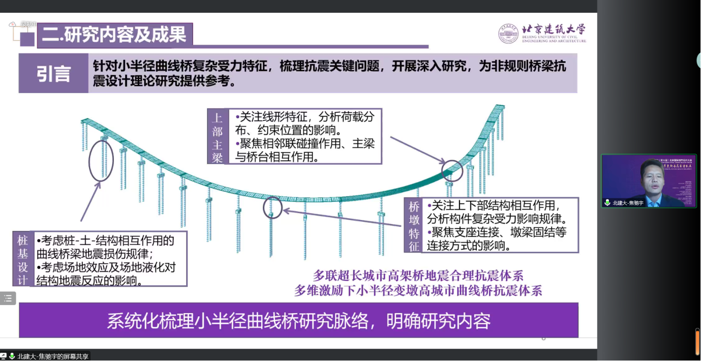 焦驰宇教授做《城市曲线桥抗震防灾关键技术研究》专题报告,研究了复杂受力桥墩的非线性力学行为、考虑墩高和碰撞的小半径曲线桥的损伤破坏规律,提出了考虑扭转效应的骨架模型,建立了非规则桥梁墩柱数值模拟方法。
